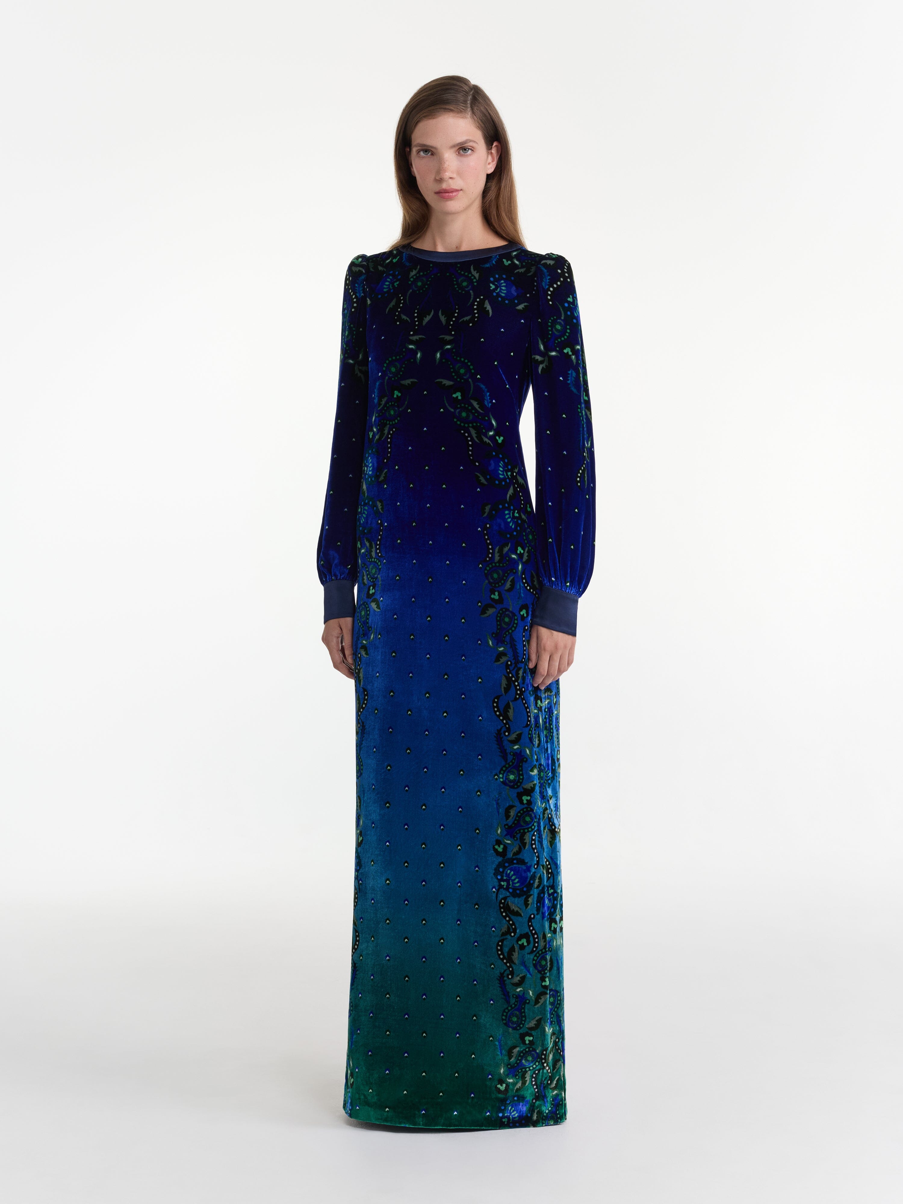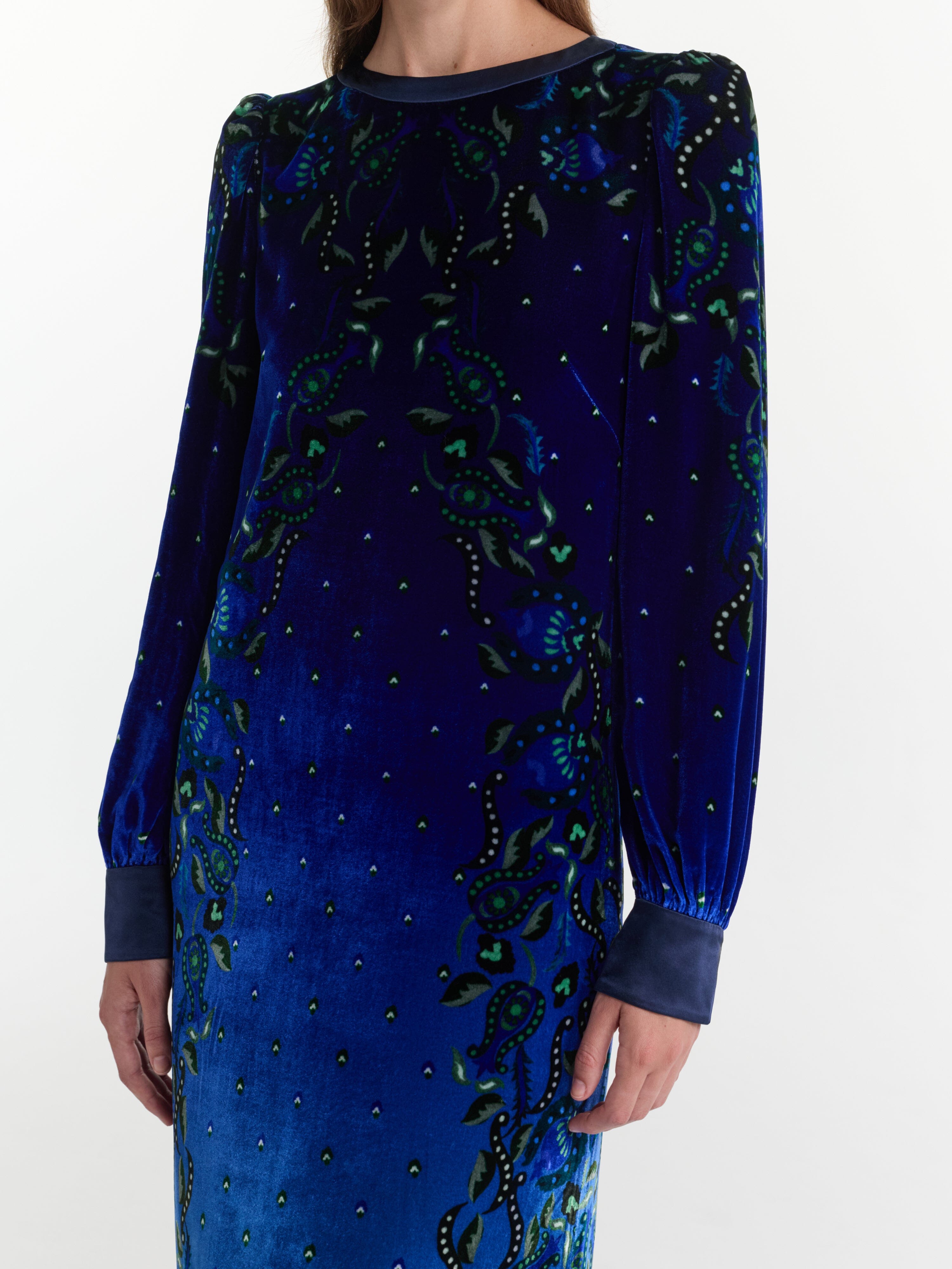 The Amrit Kurta is designed to offer the perfect balance between elegance and comfort. The rich velvet is adorned with the Budapest Twilight print placement....