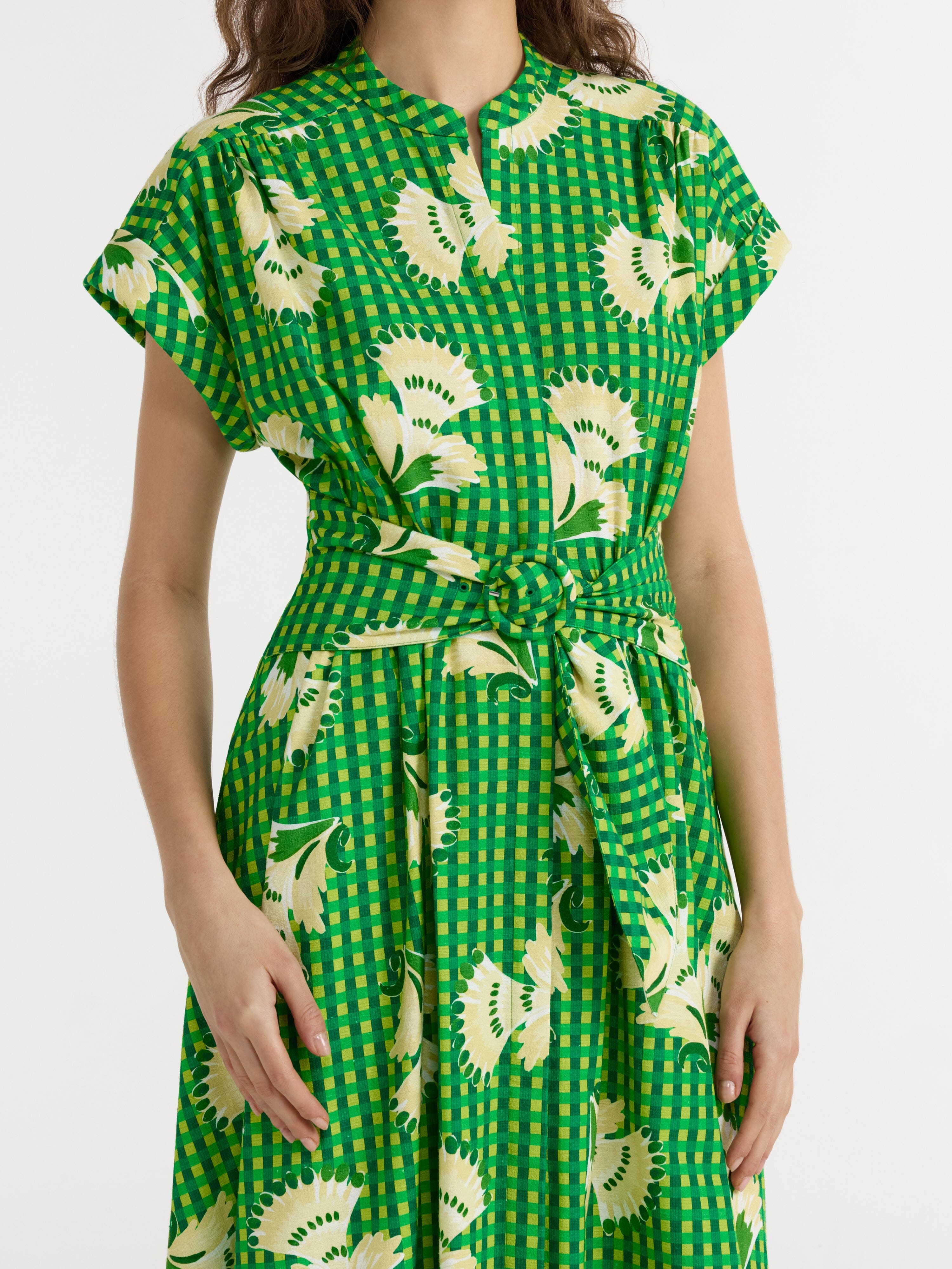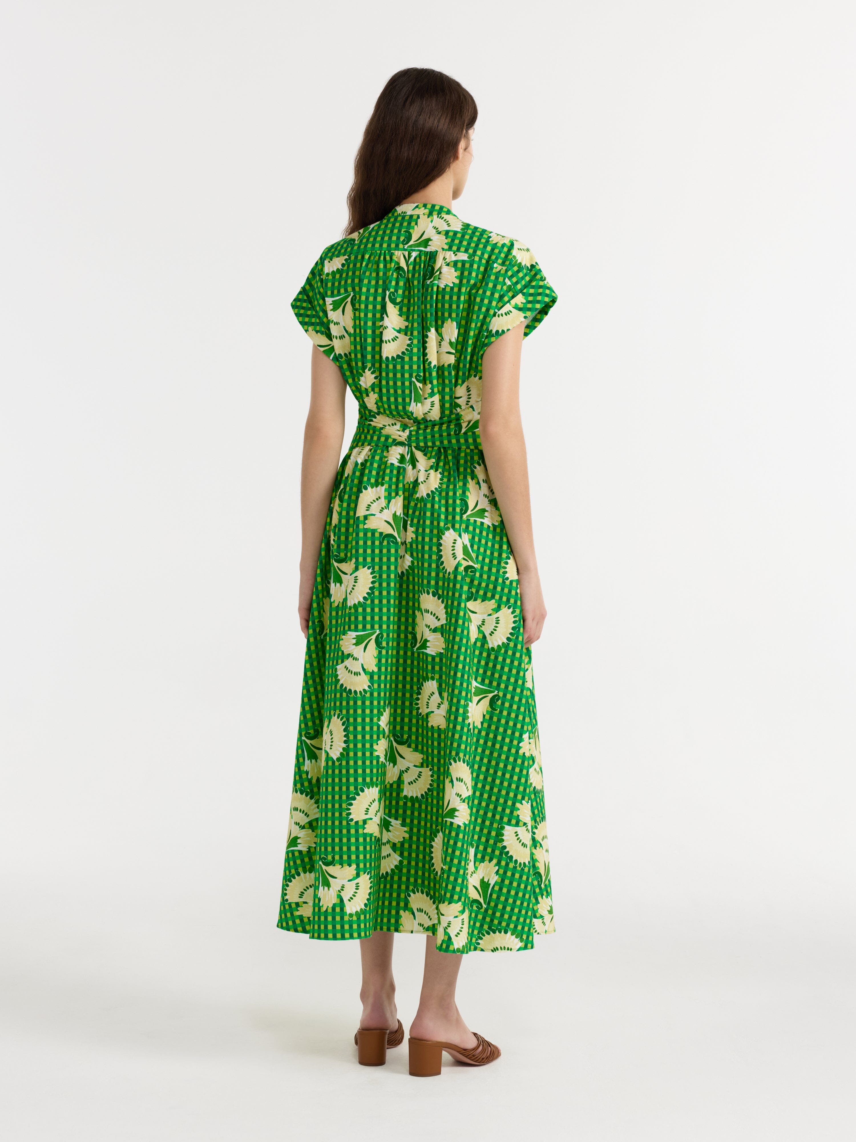 The Neesha Dress in floral-printed green gingham is a contemporary cotton shirt dress featuring soft waist gathers that create a relaxed yet flattering silhouette. A...
