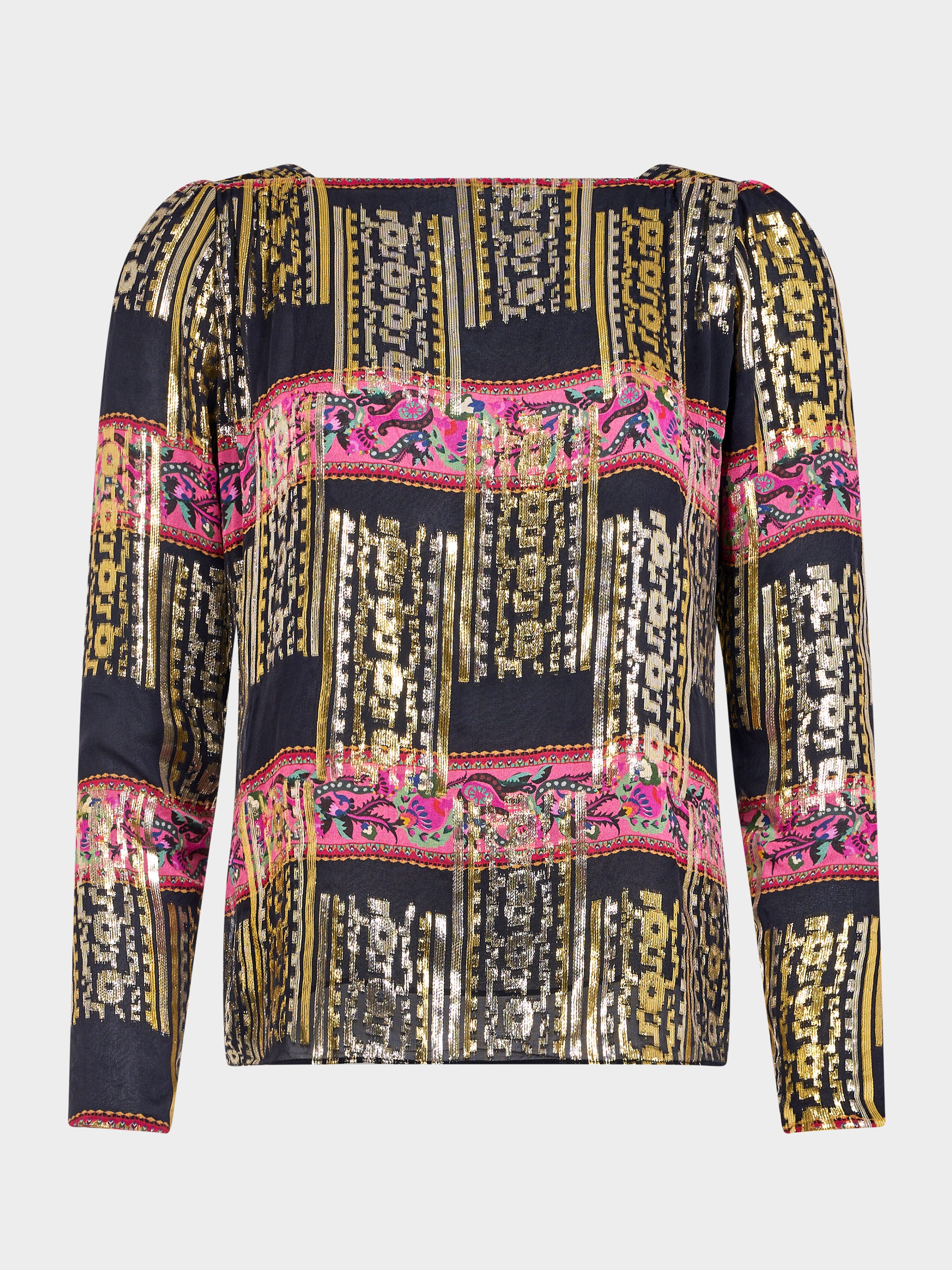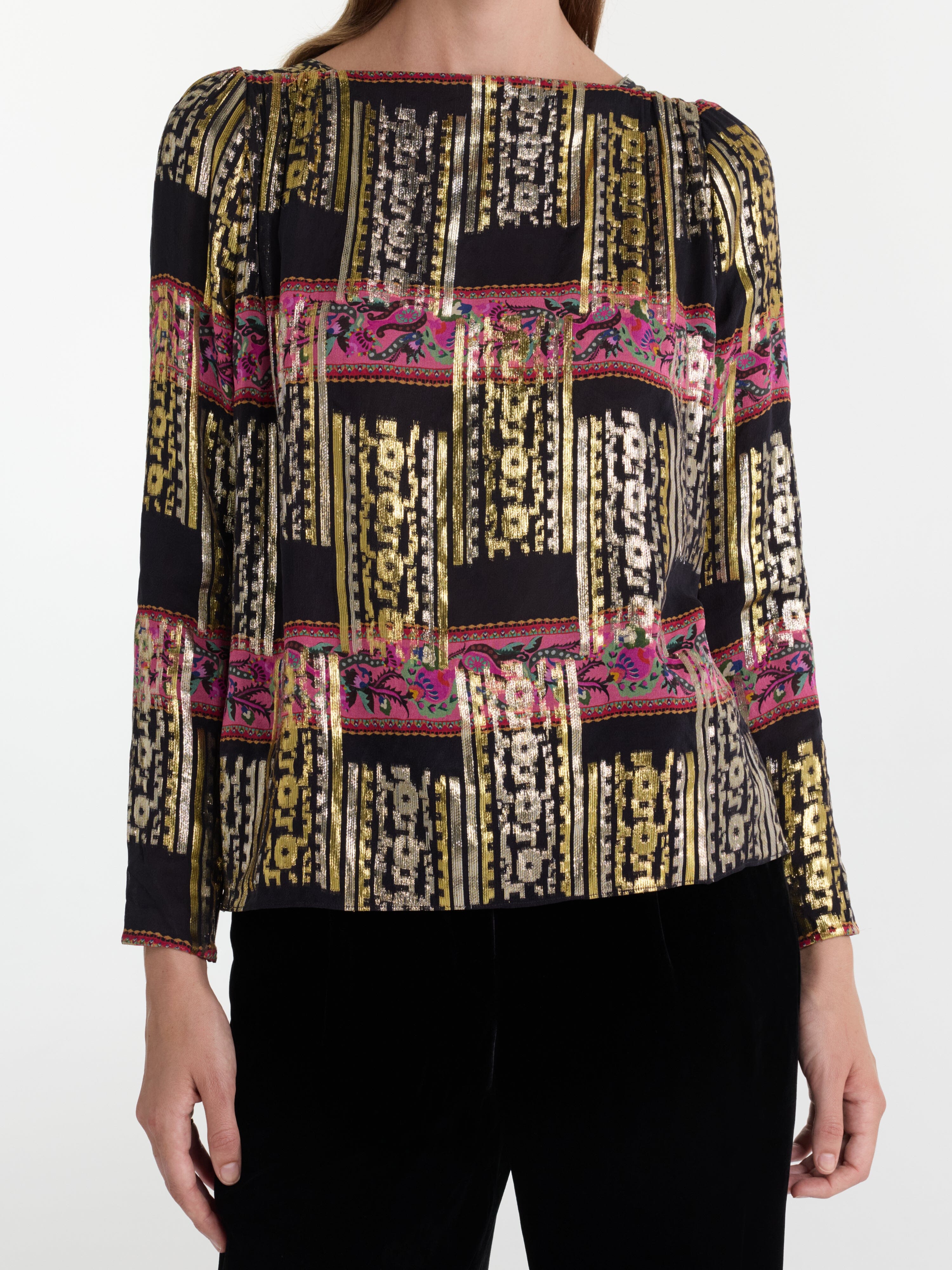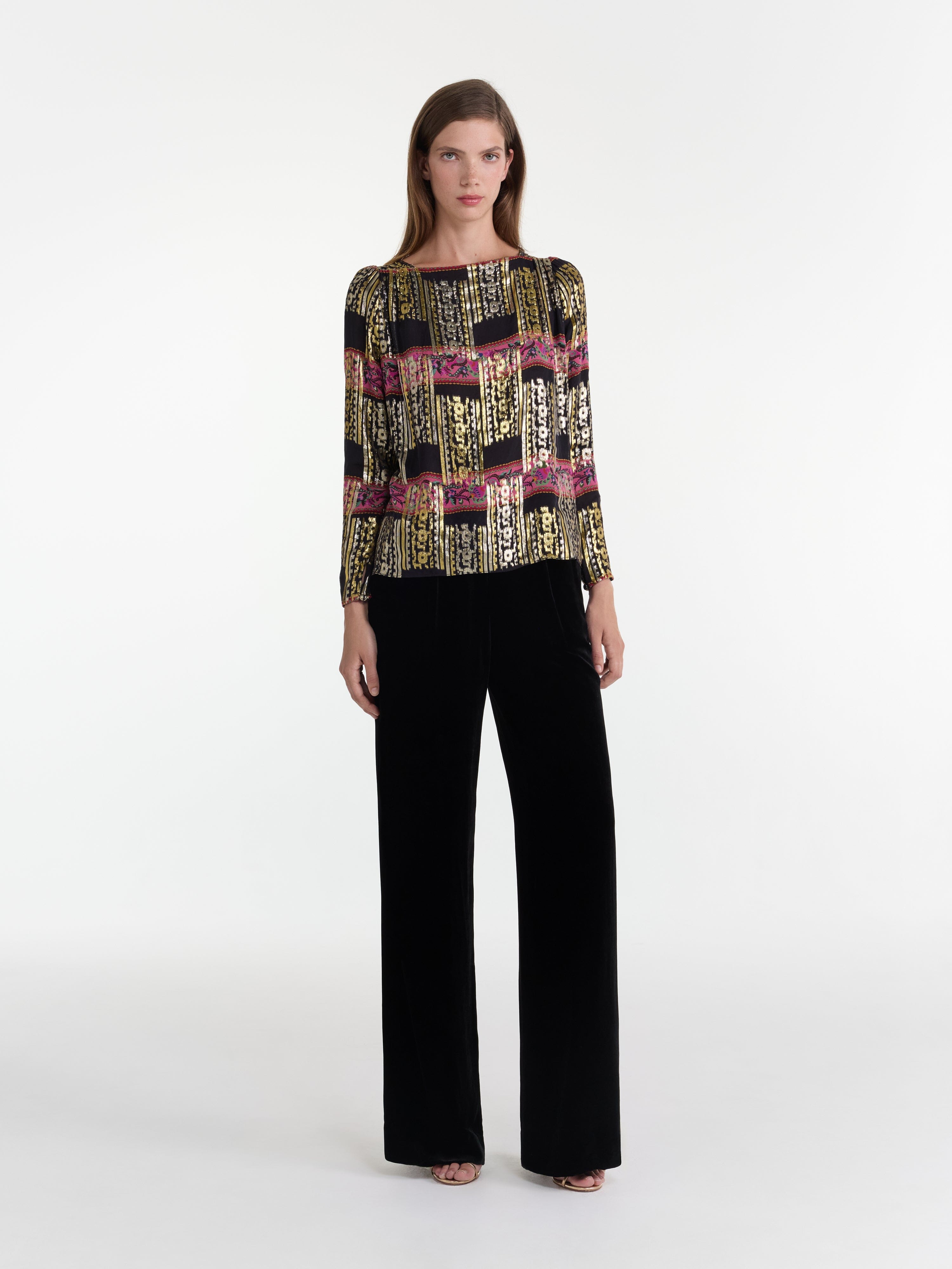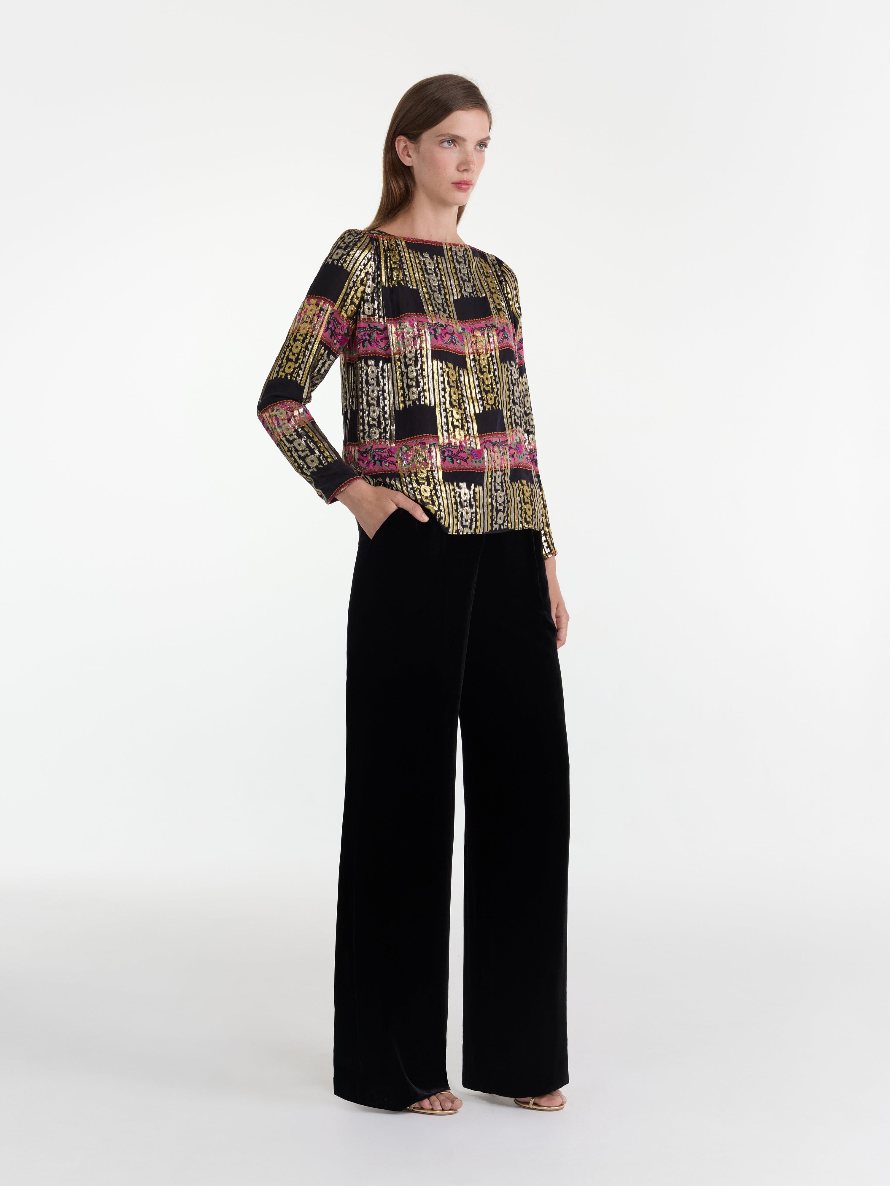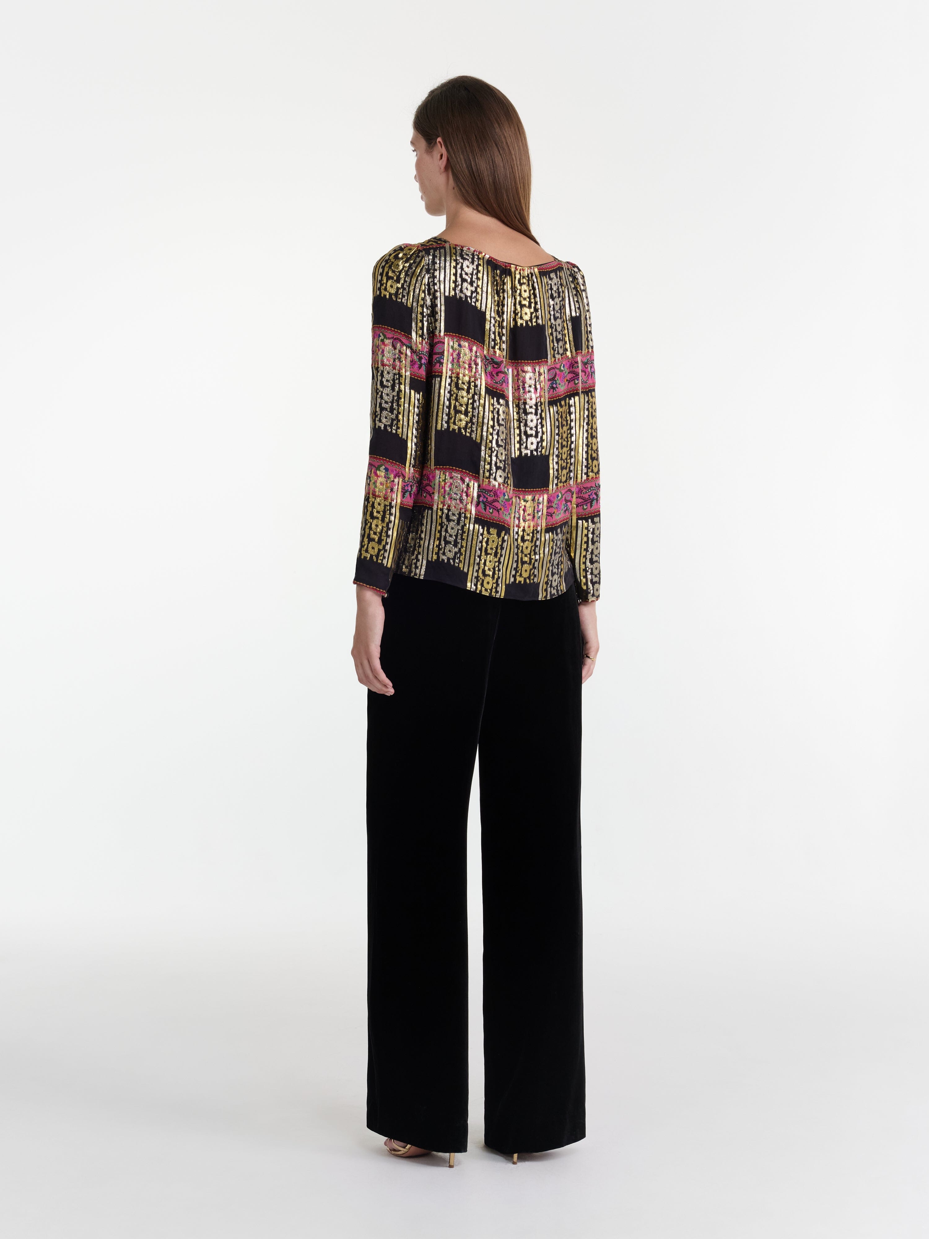 Crafted from a shimmering metallic jacquard, the Kerri Top has a soft, flowing design with long sleeves that fall gracefully, creating a flattering, relaxed silhouette....