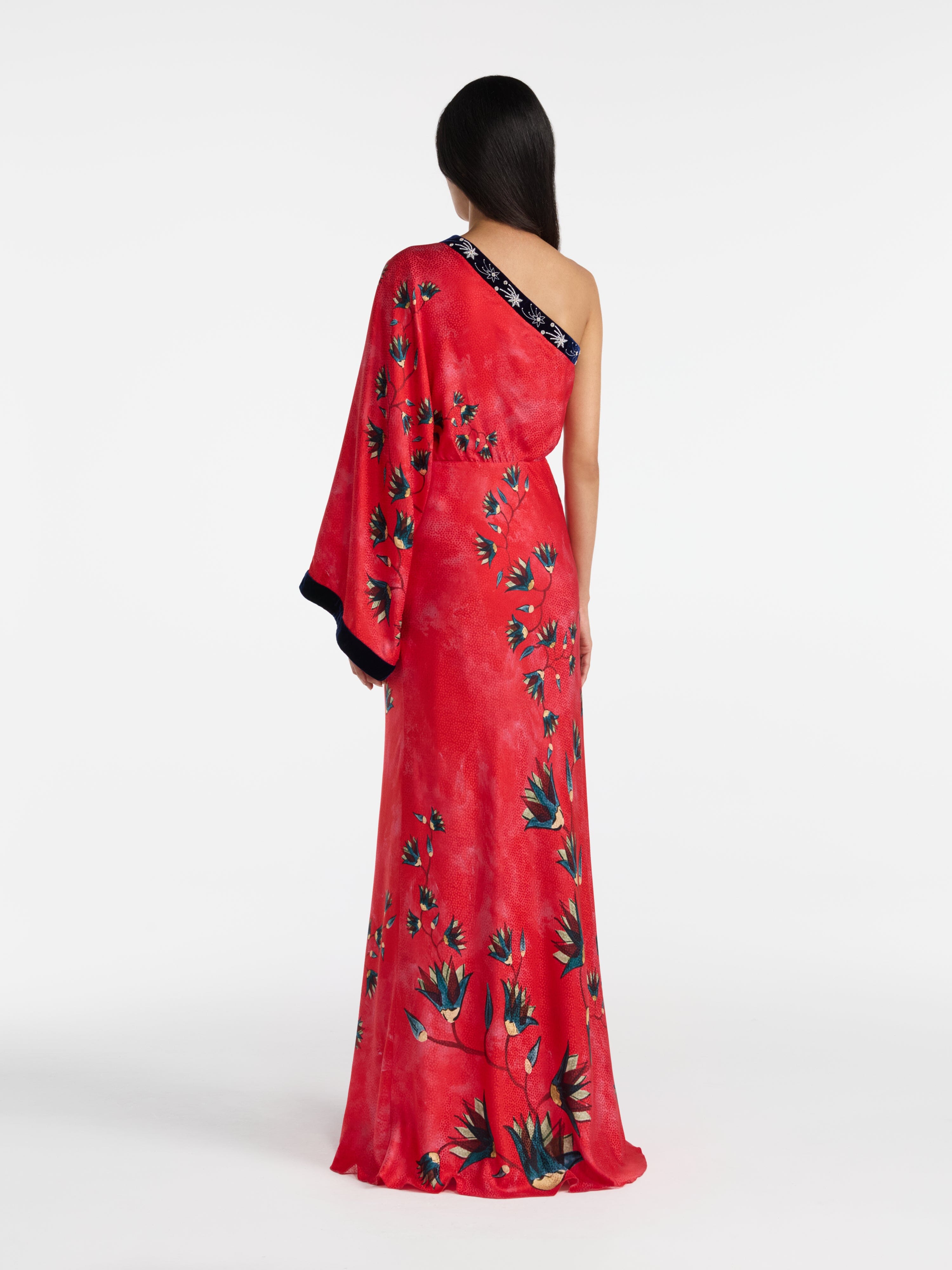 The Lily Kimono Dress is a unique statement style in stamped satin. Its sculptural, asymmetric silhouette is accentuated by a sophisticated print placement in which...