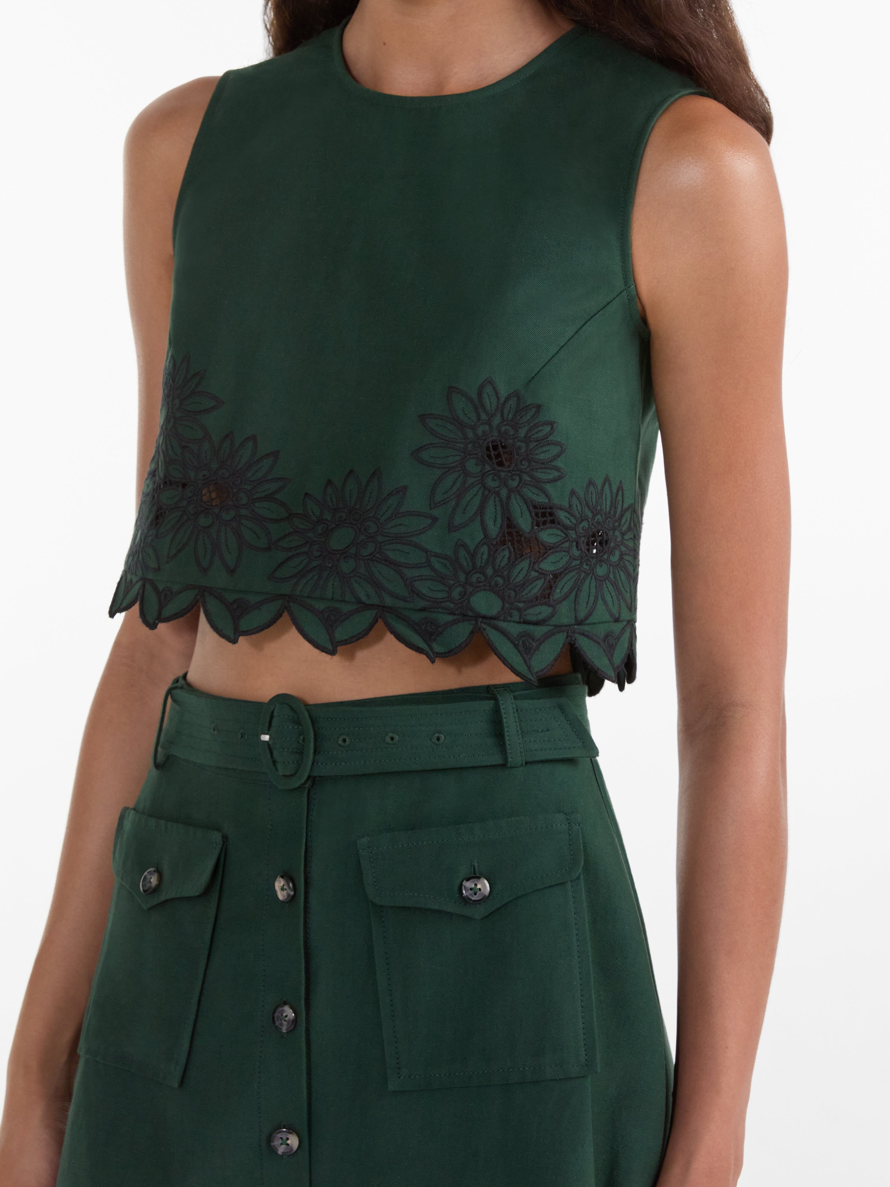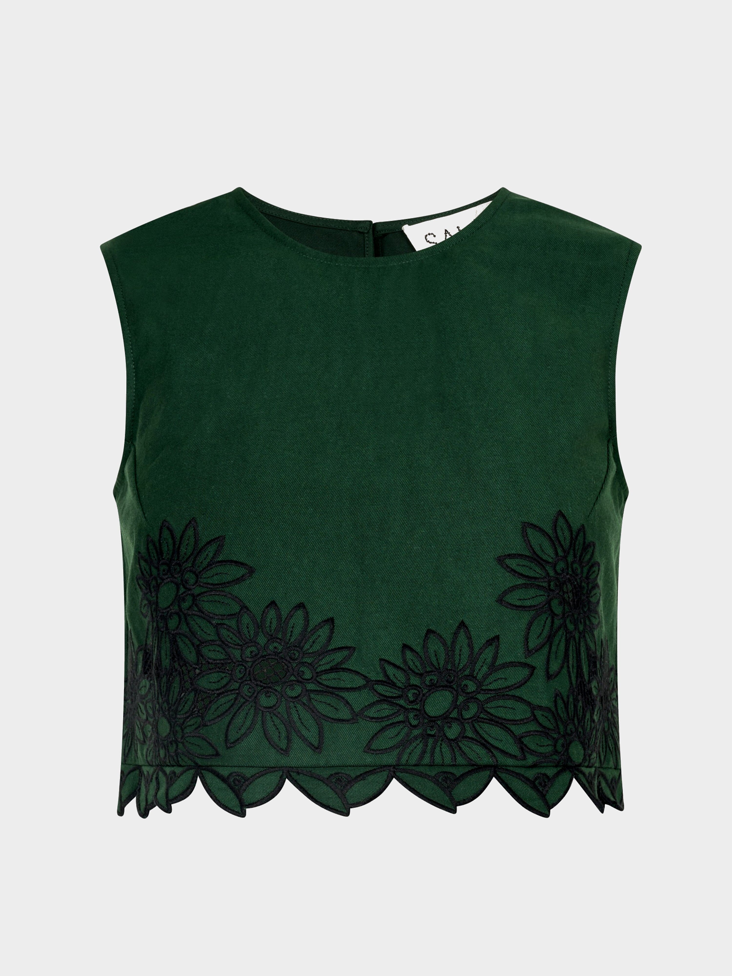 The Beth C Crop Top in Pine Green Daisy is a refined, sleeveless top with a classic round neckline, crafted from breathable cotton. Delicate tonal...