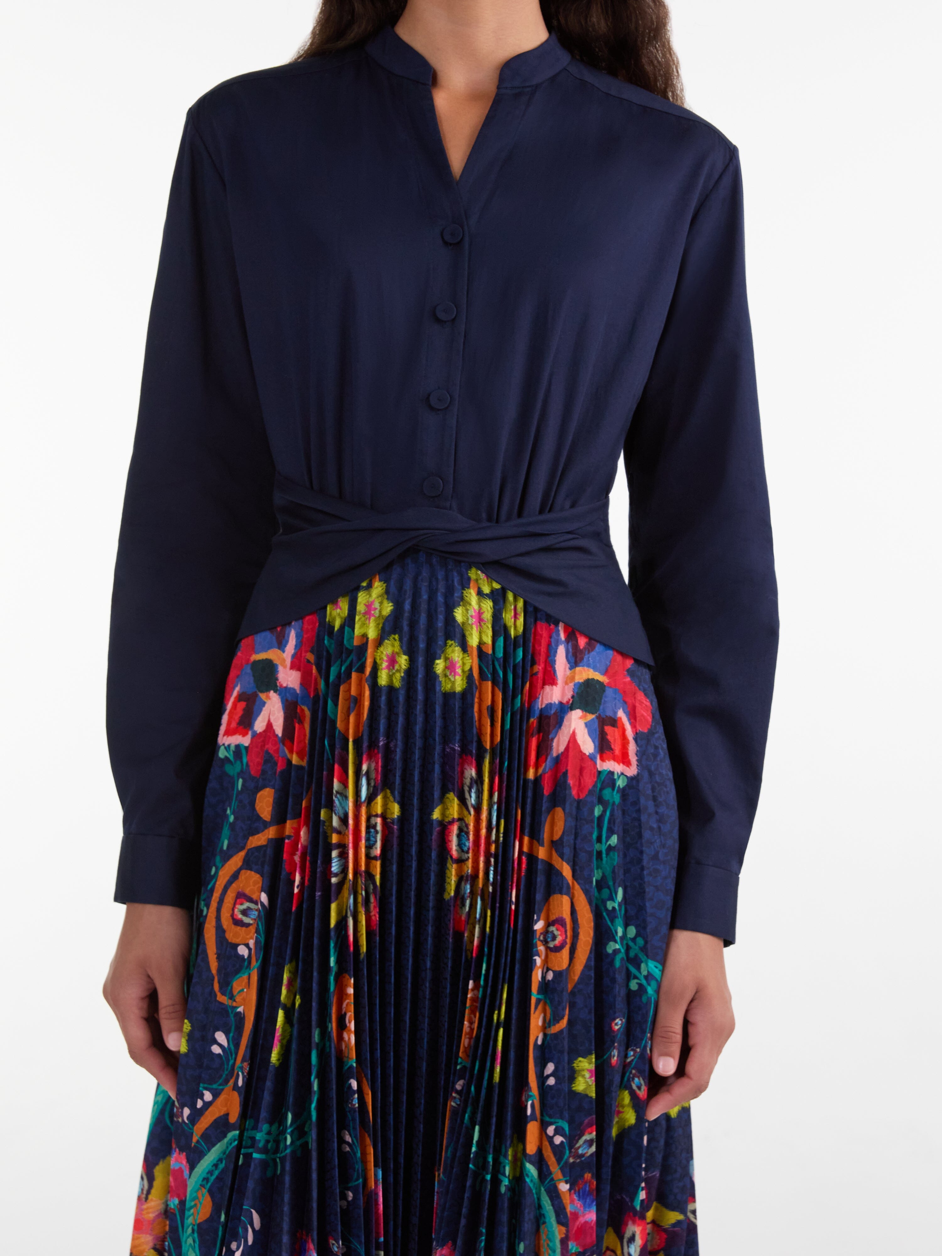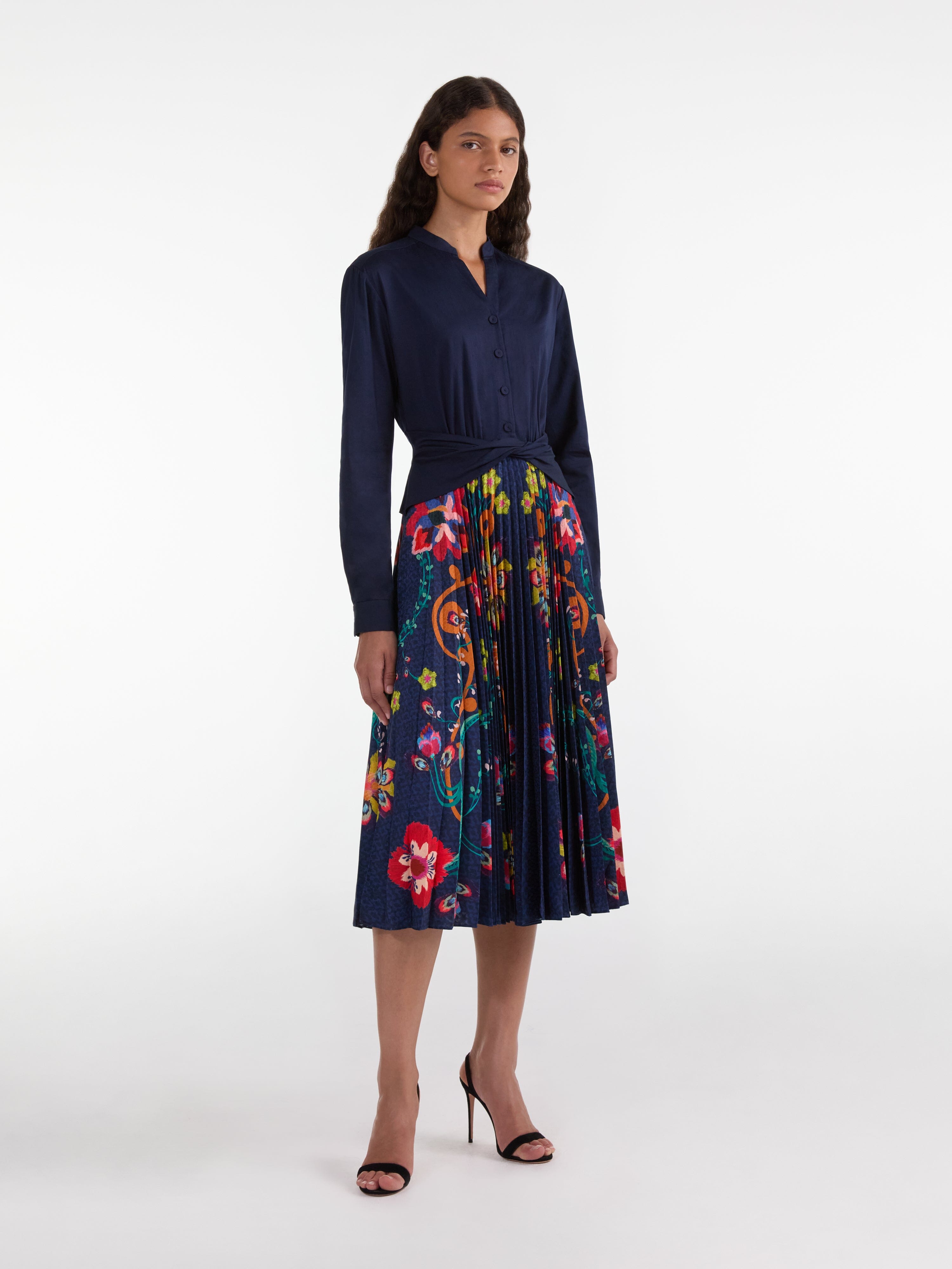 The Dhyani Dress seamlessly blends classic comfort with elegant flair. It combines a tailored and fitted cotton shirt in navy with a floral satin-pleated skirt,...