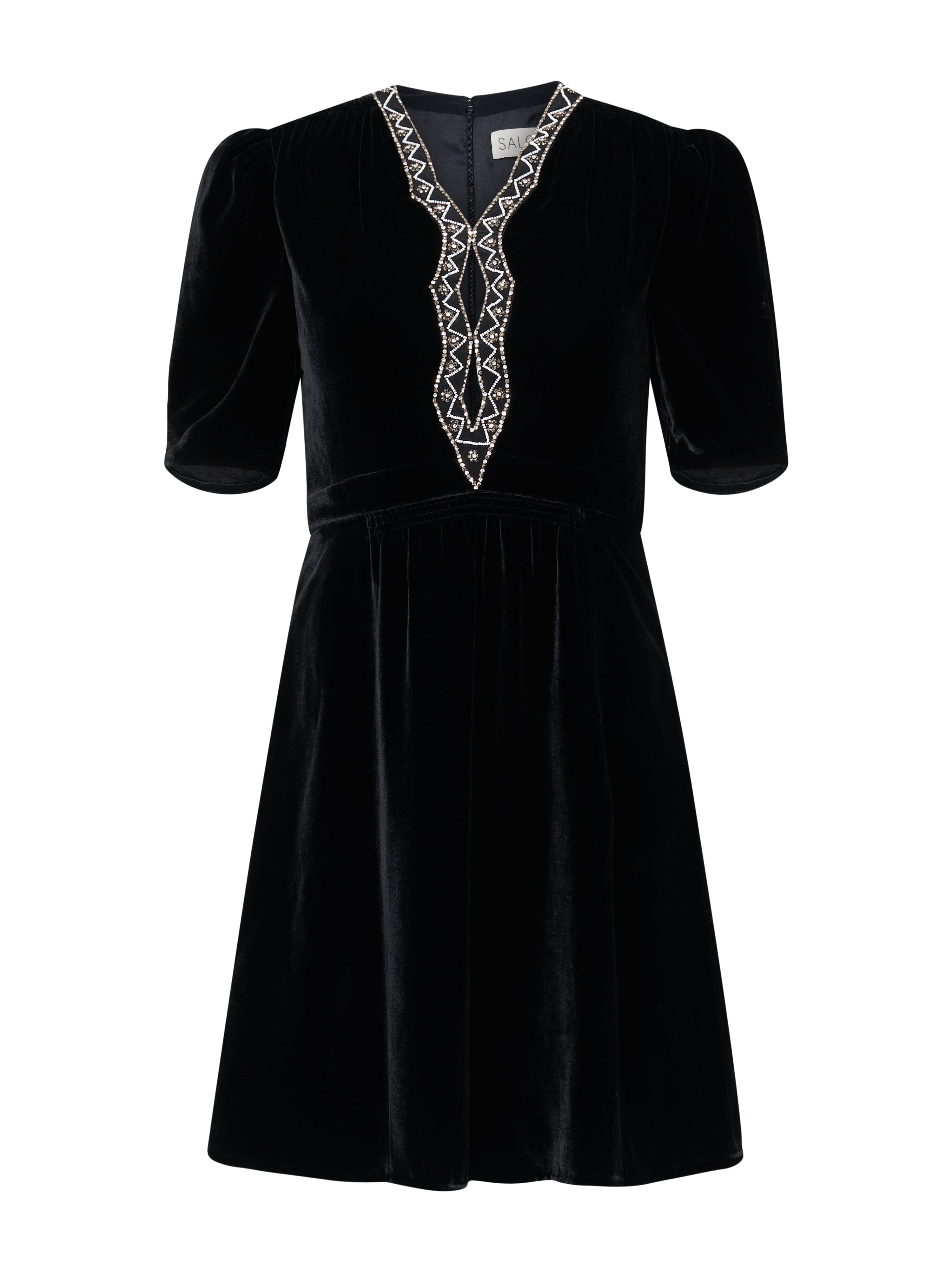 Our Tabitha mini dress is updated for the holiday season in black with diamante embroidery. The neckline is further bordered with pearl beads, and seed...